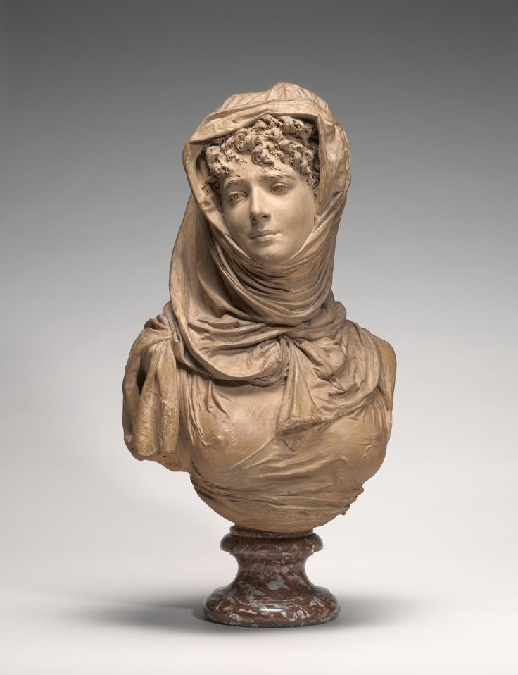 Fantasy Bust of a Veiled Woman is one of three known examples of the same composition. Previously unrecorded, it is the best version. The others are a painted plaster in the Museum of the Second Empire at the chateau of Compiègne, France, and a partially stripped and repainted terracotta in the Carnavalet Museum, Paris. All were mold-made, but in this sculpture a few mold lines, almost as fine as human hairs, have been preserved. They are evidence of the precision and technical quality of this bust, the style of which may ultimately have been inspired by late sixteenth-century French sculptures such as Germain Pilon’s renowned Virgin of Sorrows (marble example in Saint-Paul-Saint-François, Paris; terracotta in the Louvre), with its heavy veil.